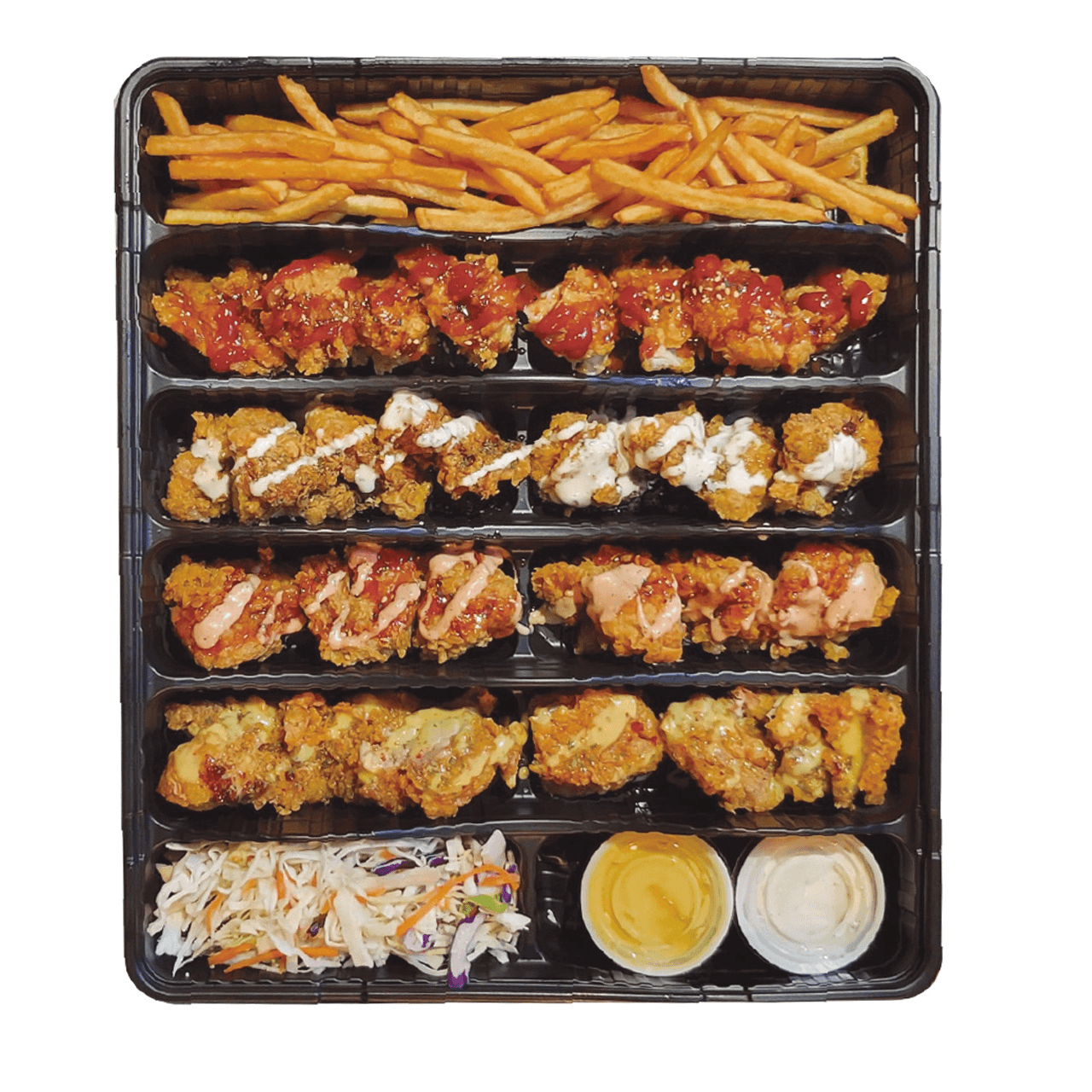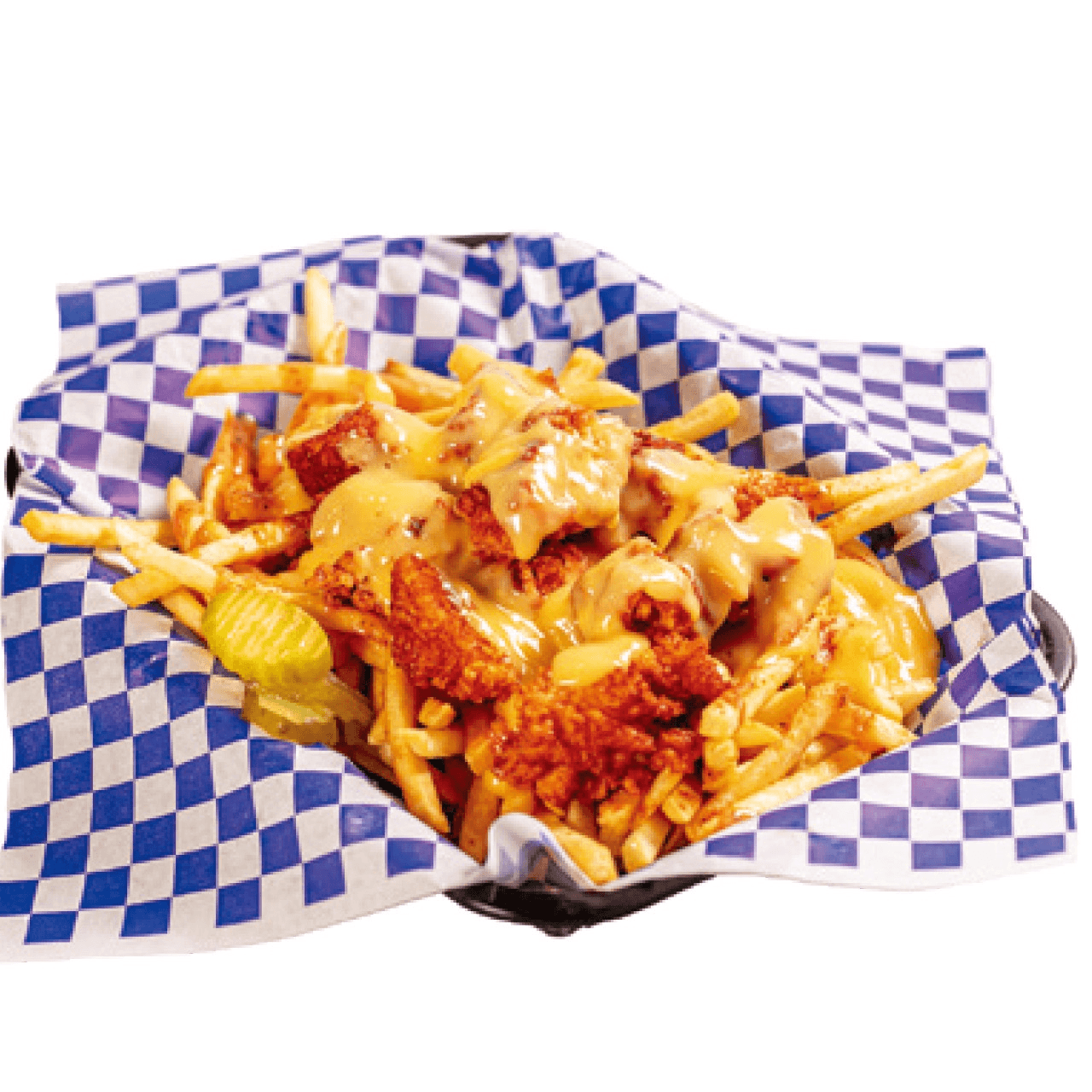 French fries topped with two tenders (choose 1 Hot level), cut into bite-sized pieces, drizzled with cheese sauce and LHC sauce, and served with coleslaw and pickles on the side