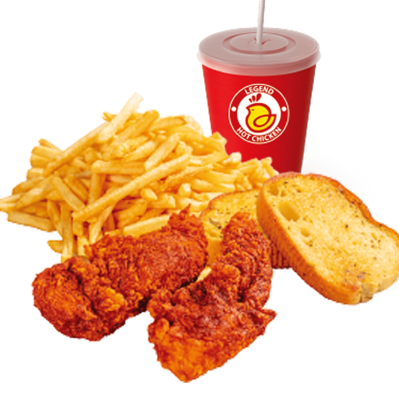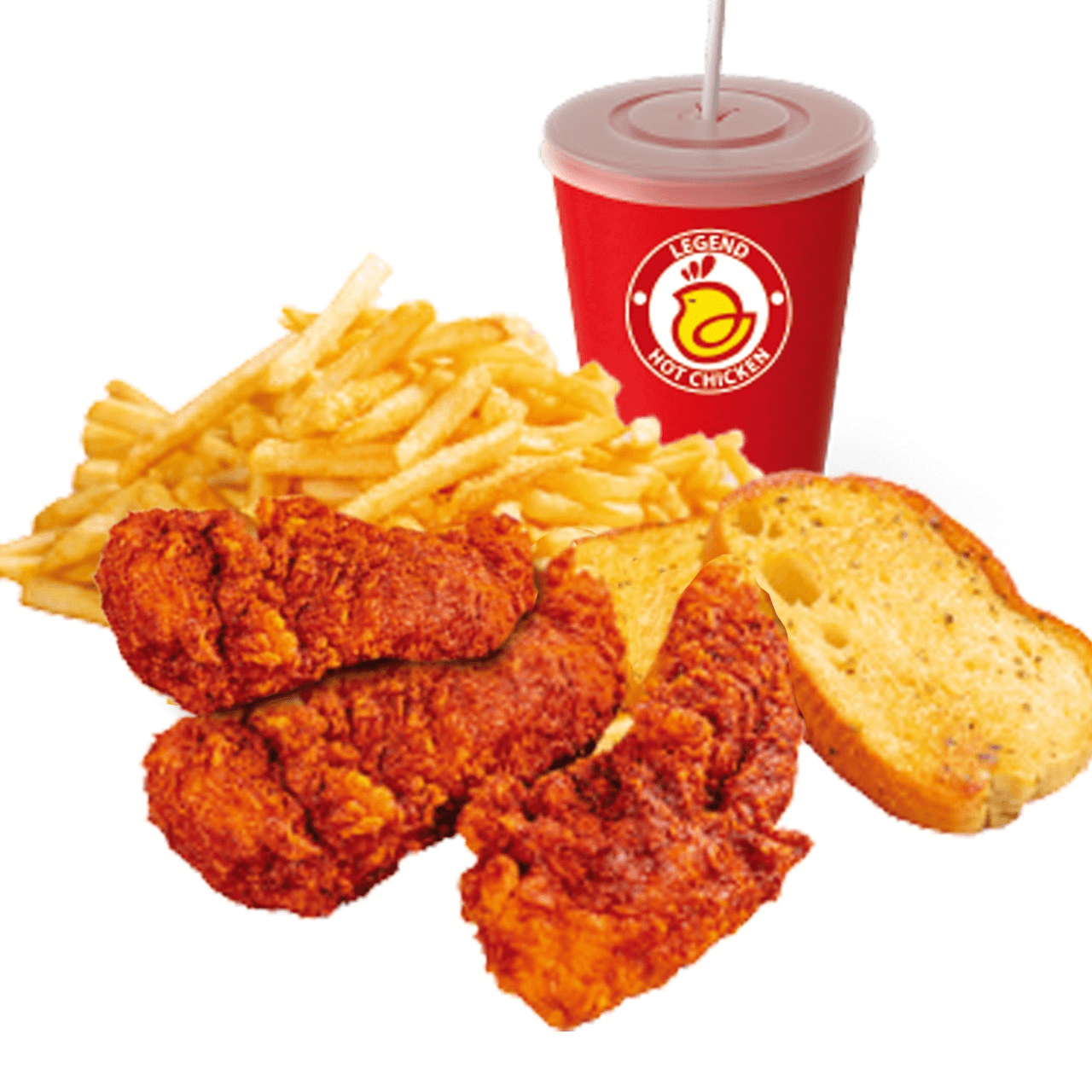 3 pcs Tenders (1 Hot level or 1 Flavor Choice) + 2 Toasts + Fries + Drink