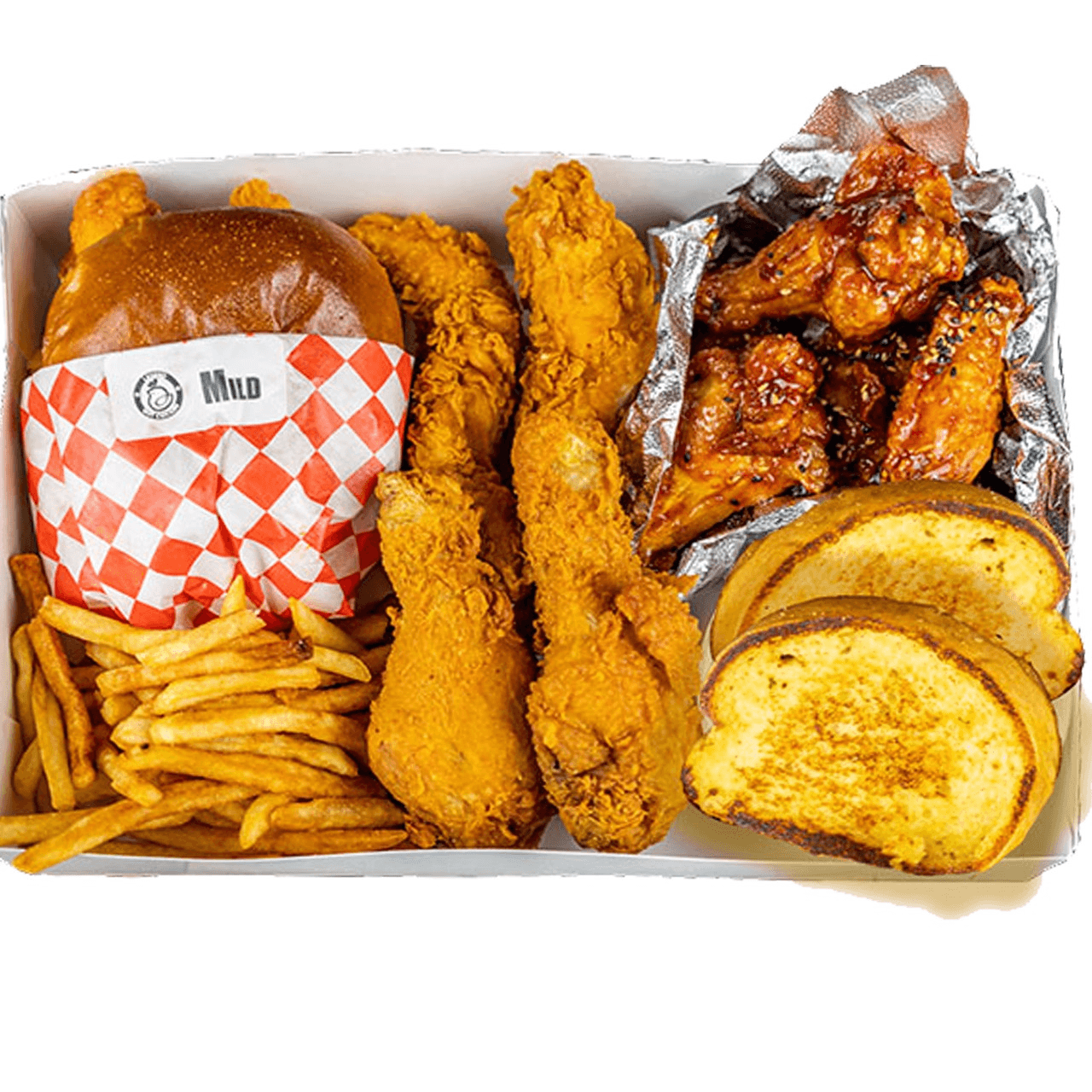 Sando(1 Hot Level or Flavor) + 6 Wings(1 Flavor) + 2 Drumsticks(Original) + 2 Tenders(Original) + Fries + 2 Toasts + 2 Dips+ 1 Drink