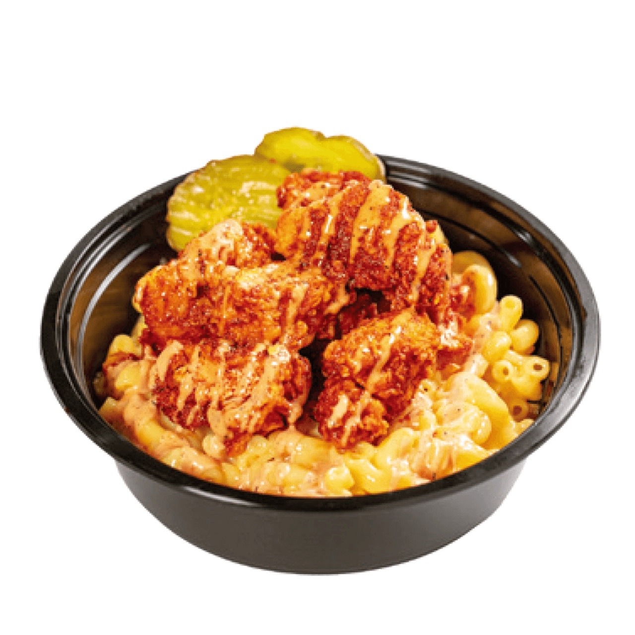 Mac & Cheese topped with two tenders (choose 1 hot level), cut into bite-sized pieces, drizzled with LHC sauce