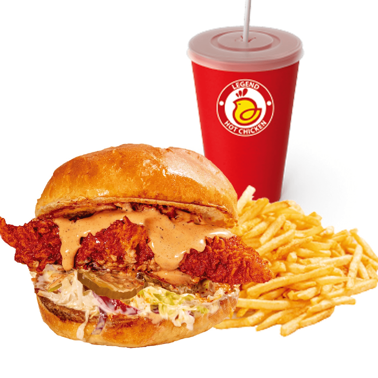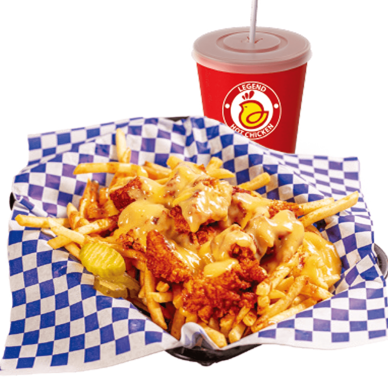 French fries topped with two tenders (choose 1 Hot level), cut into bite-sized pieces, drizzled with cheese sauce and LHC sauce, and served with coleslaw and pickles on the side + 1 Drink