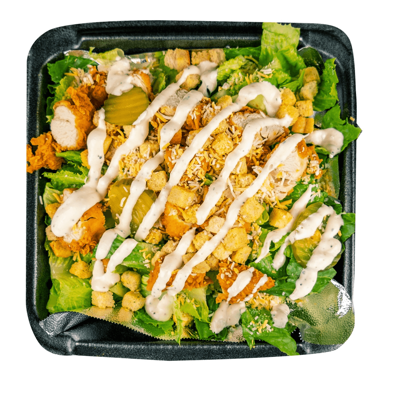 2 pcs Tenders (Hot level) + Romaine + Shredded Cheese + Croutons + Dressing (1 Choice from 4 oz Ranch, Honey Mustard, or LHC) Romaine Lettuce + 2 Tenders