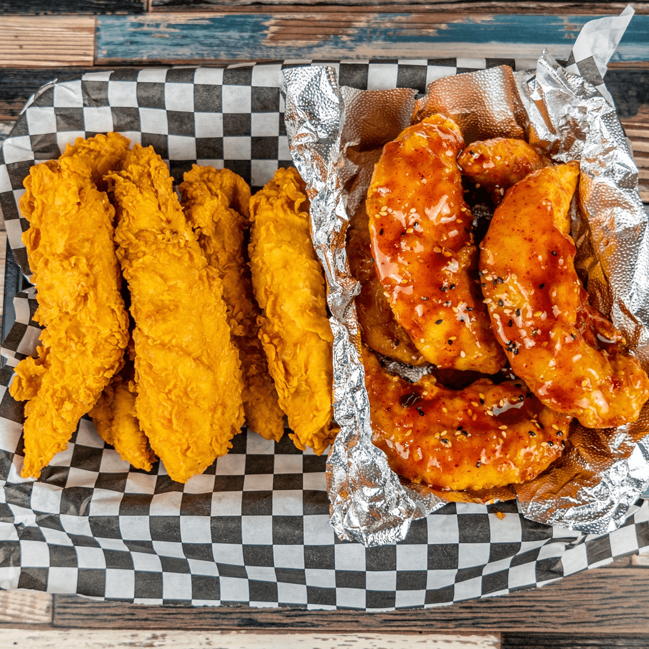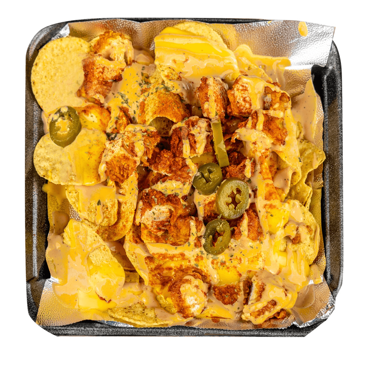 Nachos topped with two tenders (choose 1 spicy level), cut into bite-sized pieces, drizzled with cheese sauce, and topped with jalapeños