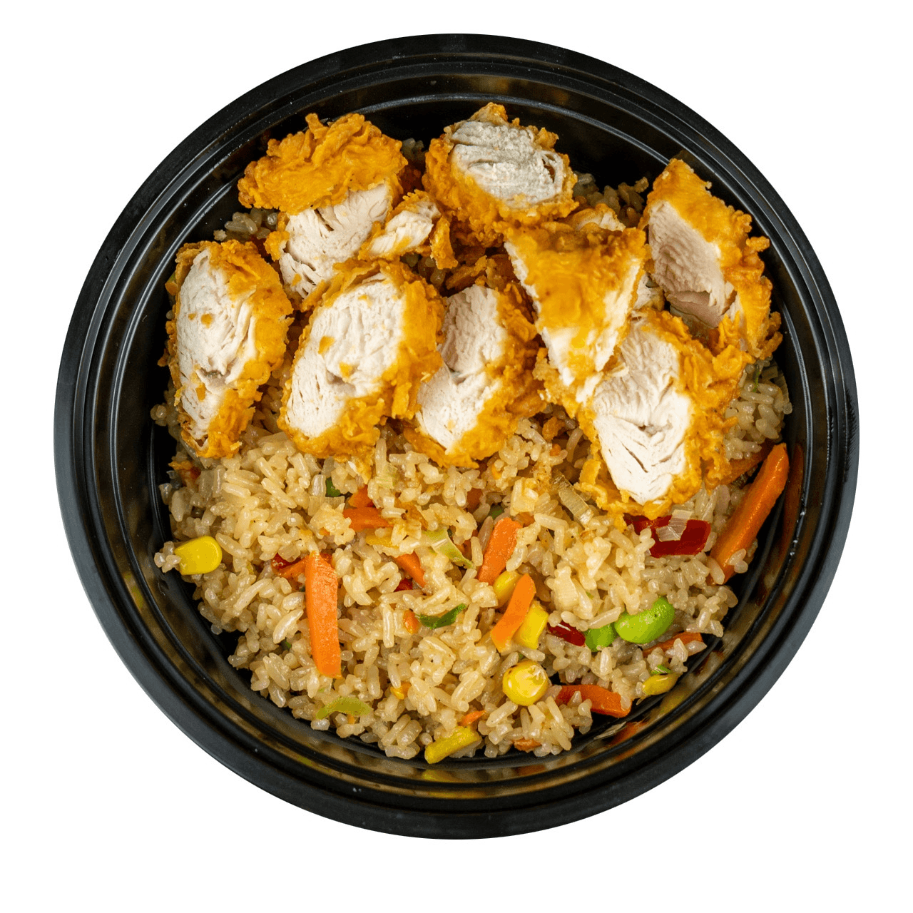 Vegetable fried Rice topped with 2 tenders (choose 1 spicy level), cut into bite-sized pieces.