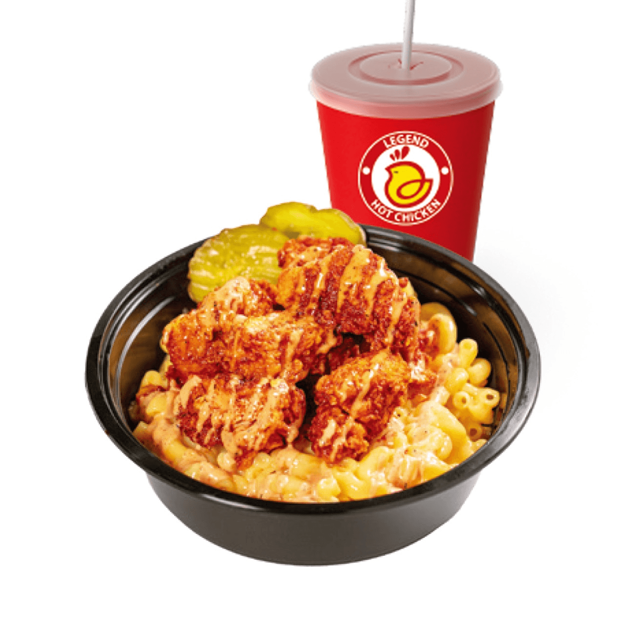 Mac & Cheese topped with two tenders (choose 1 hot level), cut into bite-sized pieces, drizzled with LHC sauce + 1 Drink